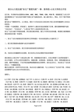 这封公开信由山大历史系78级王书君、电子专业77级曹海波、生物系77级谈小云等一百多名校友联署。公开信提到多家西方主流媒体报道孙文广教授是在接受美国之音连线采访时被人强行闯入带走的消息,但是没有提到孙文广被带走时正在呼吁中共领导人习近平正视众多中国人仍然贫困的现实,停止将亿万金钱慷慨援外的所谓“撒币外交”做法。