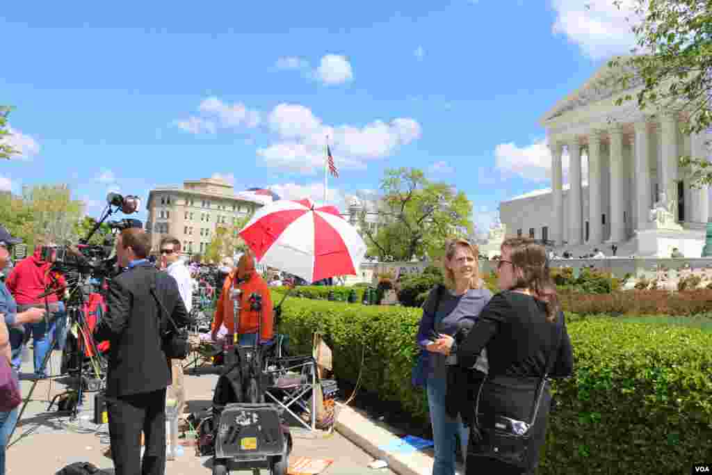 美国最高法院在华盛顿就全美范围男女同性伴侣是否拥有宪法赋予的结婚权利听取了口头辩论。最初的提问显示,大法官们仍旧以保守派和自由派划界。在法院听讯前,数百名支持或反对同性婚姻的活动人士聚集在高等法院外面。