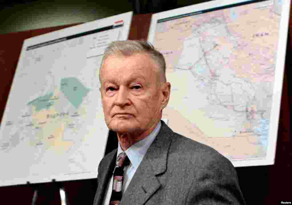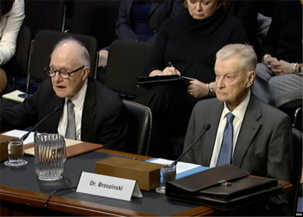 2007年2月1日, 前美国总统的国家安全顾问布热津斯基在参议院外交委员会听证会上。 布热津斯基是颇有影响力的外交政策理论家,著有《大棋局—美国的首要地位及其地缘战略》、《大抉择—全球统治或全球领导》和《大失控—解读新世纪乱象》等著作。他在2011年出版的著作《战略远景:美国与全球权力危机》中表示,美国在海外的实力对全球稳定至关重要,不过这也取决于美国如何克服收入不均和实施有意义的应对气候变化的措施。