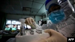 中国一名医护人员拿着新冠病毒感染者的样本准备进行核酸检测。资料照:2020年3月10日。