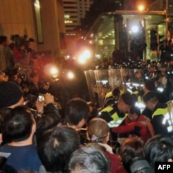 在投票结束后,一些抗议者还试图闯进立法会,与政府官员和亲政府的议员论理,但最终无法冲破警方的人墙。