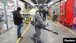 在俄罗斯首都莫斯科,一名身着防护装备的人在喷洒消毒剂。(2020年4月9日)