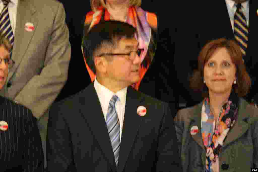 代表们在合影前互相交谈(美国之音林枫拍摄)